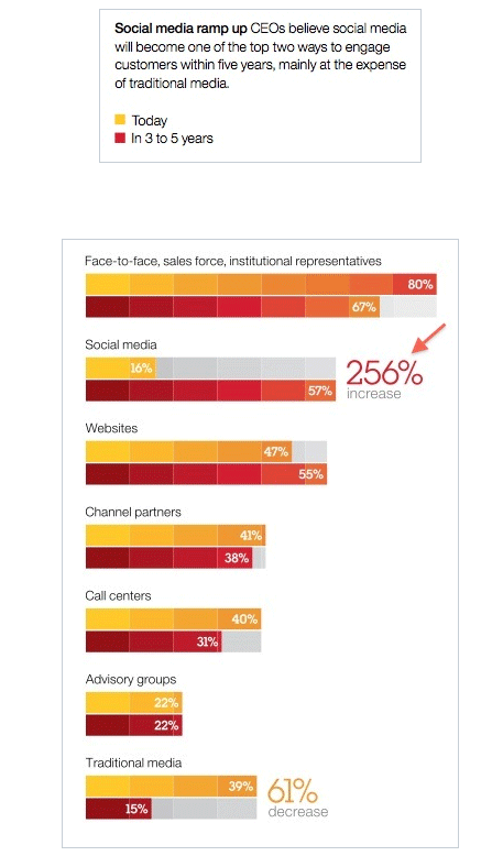 As you can see in the chart below, only 16 percent of companies are using social media to connect with customers, but that number is expected to increase to 57 percent within the next three to five years. The CEOs in the study predict that social mediawill push past websites, call centers and channel partners as the number-two way to interact with customers.